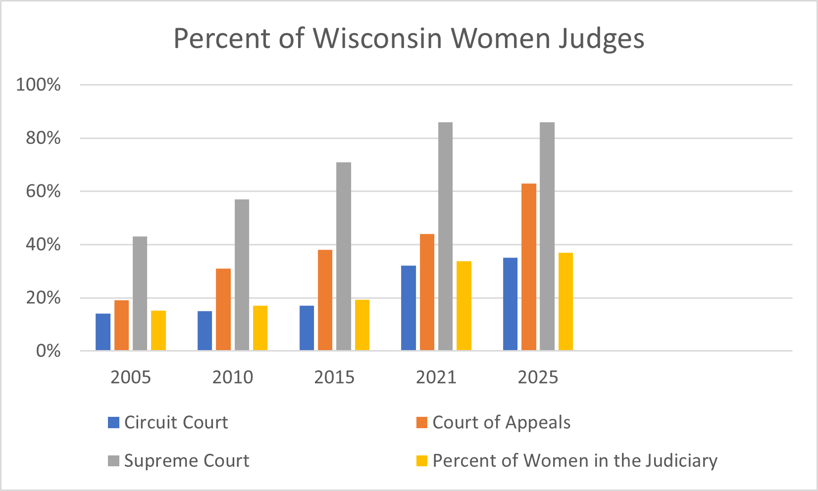 Women’s representation in Wisconsin’s courts has continued to grow over the past 20 years. All three court levels—Circuit Court, Court of Appeals, and Supreme Court—show steady increases in the share of women serving.