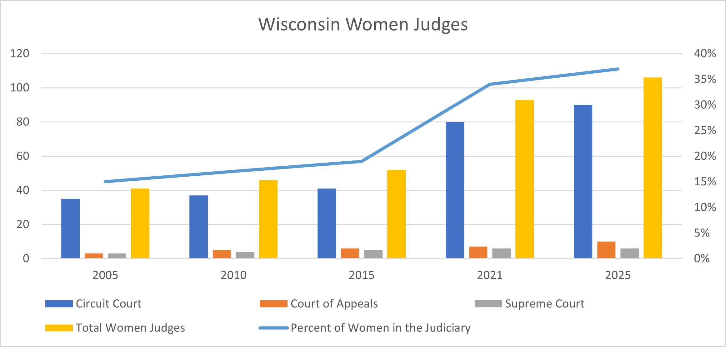 The total number of women serving as judges in Wisconsin has increased substantially, rising from 41 in 2005 to 106 in 2025. Increases within the Circuit Courts primarily drive this growth. As women’s numbers have grown, so has their overall share of the judiciary, reaching nearly 37% in 2025, up from 15% in 2005.